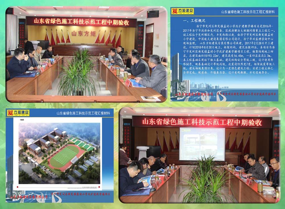 為加快推進新舊動能轉(zhuǎn)換產(chǎn)業(yè)升級,大力推廣綠色建筑施工建造模式,推動省級綠色施工科技示范項目建設(shè)再上新臺階。近日,山東方矩建筑安裝有限公司承建施工的兗州區(qū)新兗鎮(zhèn)孟村小學(xué)改擴建教學(xué)樓工程,順利通過山東省綠色施工科技示范工程中期驗收,為濟寧市兗州區(qū)建設(shè)領(lǐng)域推廣綠色施工科技示范工程增光添彩!為公司創(chuàng)建綠色施工科技示范工程樹立標桿!