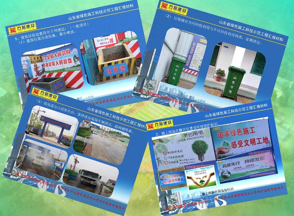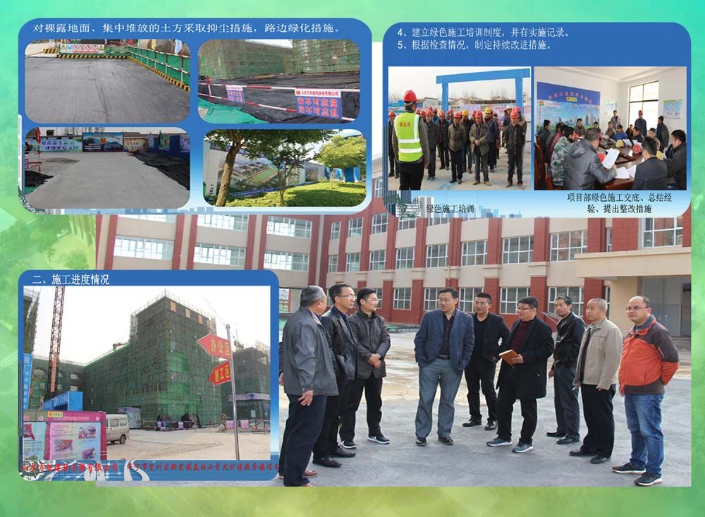 公司在推廣綠色施工科技示范工程中,嚴格按照山東省建設(shè)工程標準《建筑與市政工程綠色施工評價標準》GB37/T5087-2016有關(guān)規(guī)定進行科學(xué)管理施工,遵循因地制宜、四節(jié)一環(huán)保的原則,結(jié)合工程的建設(shè)規(guī)模、揚塵治理、環(huán)境整治、基礎(chǔ)設(shè)施資源、文明城市創(chuàng)建和企業(yè)文化等特點,依據(jù)施工管理、環(huán)境保護、節(jié)材與材料資源利用、節(jié)水與水資源利用、節(jié)能與能源利用、節(jié)地與土地資源保護、技術(shù)創(chuàng)新與推廣應(yīng)用等七大要素進行綜合評價,對每一步驟、每一環(huán)節(jié)的施工管理,始終踐行綠色施工的新理念,增添創(chuàng)建科技示范工程的新元素,為迎接省市區(qū)專家組領(lǐng)導(dǎo)的檢查指導(dǎo)階段性驗收打下良好的堅實基礎(chǔ)。
